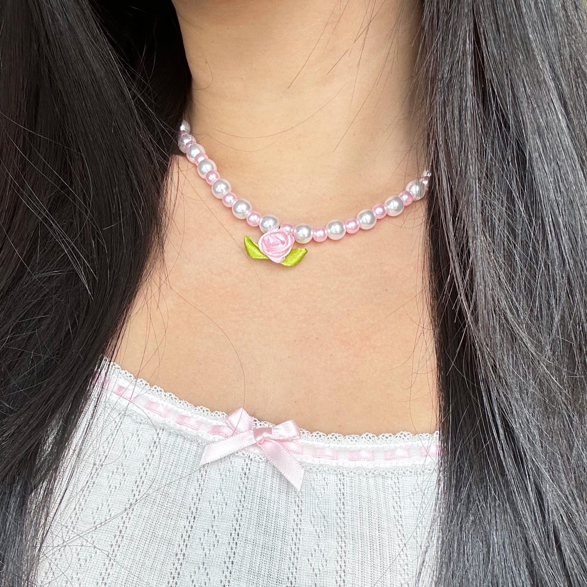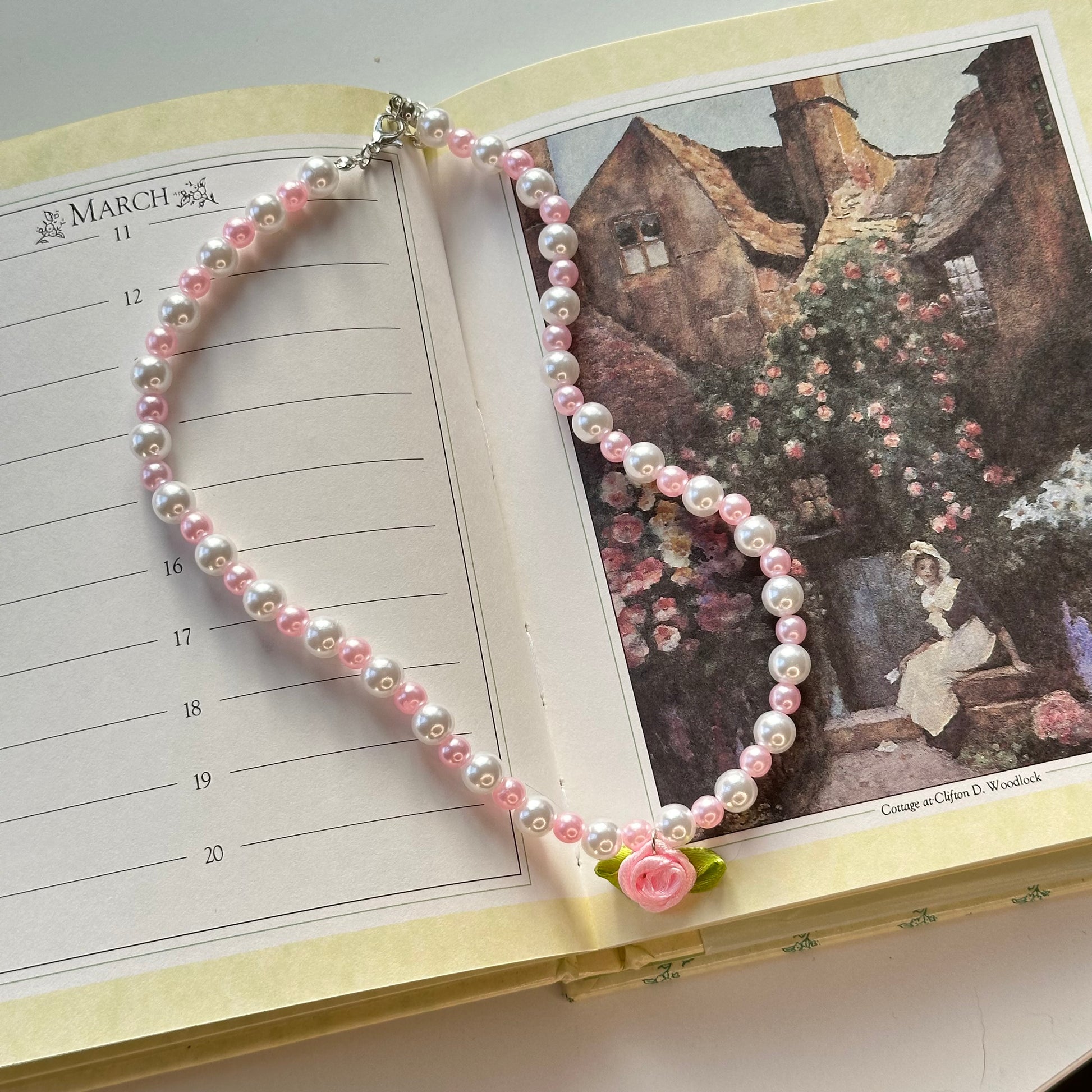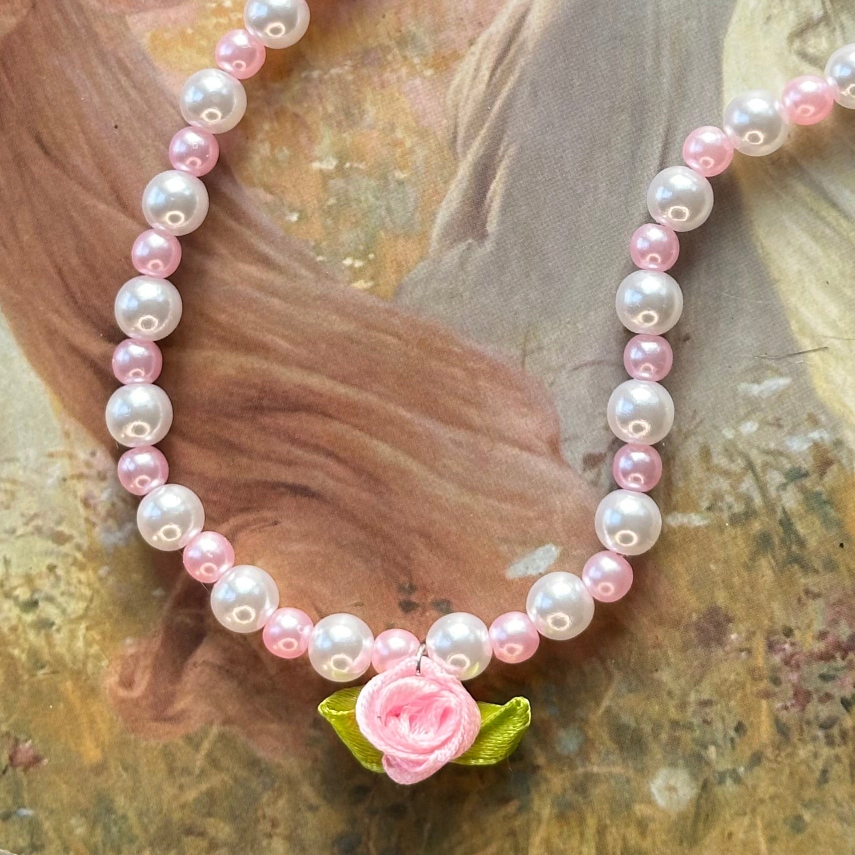 - Features: White and Pink Pearls, Tiny Satin Rose